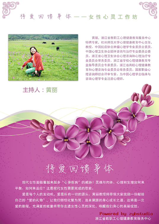 为更好地服务我省教职工,有效提升教职工的积极心理品质,促进我省女教师的心灵成长,浙江省教职工心理健康教育服务中心特别邀请了杭州师范大学心理健康教育中心主任、教授黄丽主持“将爱回馈身体”女性心灵工作坊。现将有关事项通知如下: