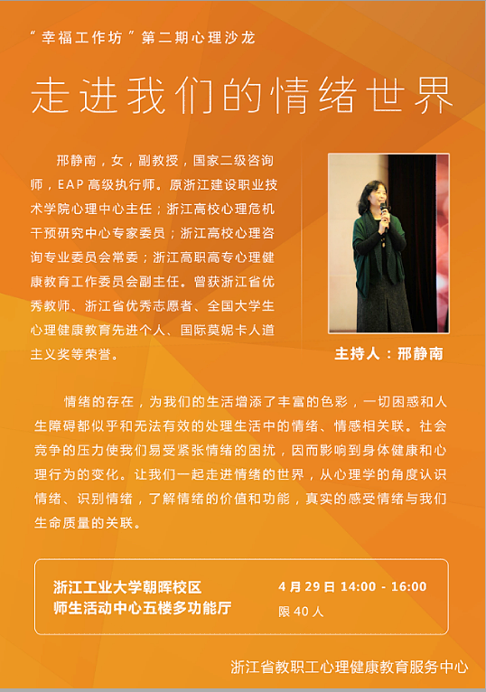 为更好地服务我省教职工,让教职工从心理学的角度认识情绪、识别情绪,了解情绪的价值和功能,真实的感受情绪与生命质量的关联,浙江省教职工心理健康教育服务中心特别邀请了浙江高校心理危机干预研究中心专家委员、浙江高职高专心理健康教育工作委员会副主任邢静南主持“幸福工作坊之走进我们的情绪世界”主题心理沙龙。现将有关事项通知如下: