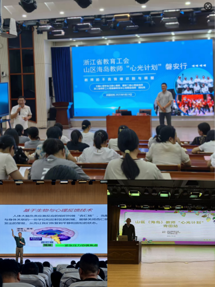 本次“心光计划”实施分三批进行:首批覆盖定海、磐安、岱山;第二批进驻景宁、遂昌;第三批延伸至青田、龙泉。心理服务活动聚焦教师群体常见的心理健康负面情绪与压力,开展个性化主题辅导。在磐安县,周杭伟教授以“教师不良情绪的识别与调整”为主题,通过游戏互动、情景体验等方式,引导教师理解情绪转换技巧;在岱山县,白羽教授从压力双面性切入,传授认知、行为、情绪三大调节策略;青田县的活动,叶立军教授引入正念呼吸与认知解离方法,帮助教师实现自我关怀;龙泉市活动中,专家进一步解析压力深层来源,提出“认知重构”“生理调适”等实操工具,广受教师好评。