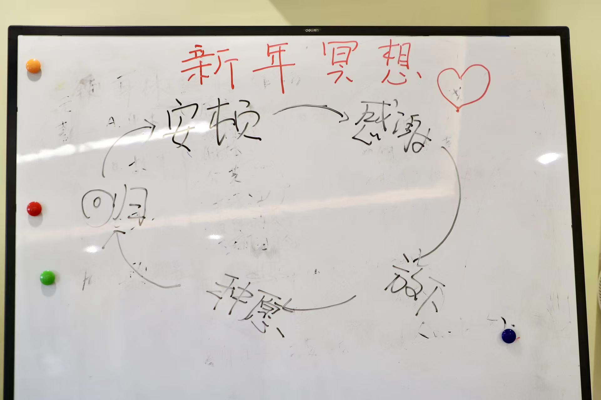 活动精心设计了五个环节。安顿环节,大家跟随徐老师调整身体姿态、专注呼吸,迅速沉浸于放松氛围;感谢环节,引导众人回顾过往,感恩自己一路的坚持与成长;放下环节,借助光盒意象,让参与者将内心的烦恼与压力具象化并释放;种愿环节,大家手心贴心口,虔诚种下新年心愿;归来环节,通过缓慢唤醒,让大家带着满满的能量回归现实。