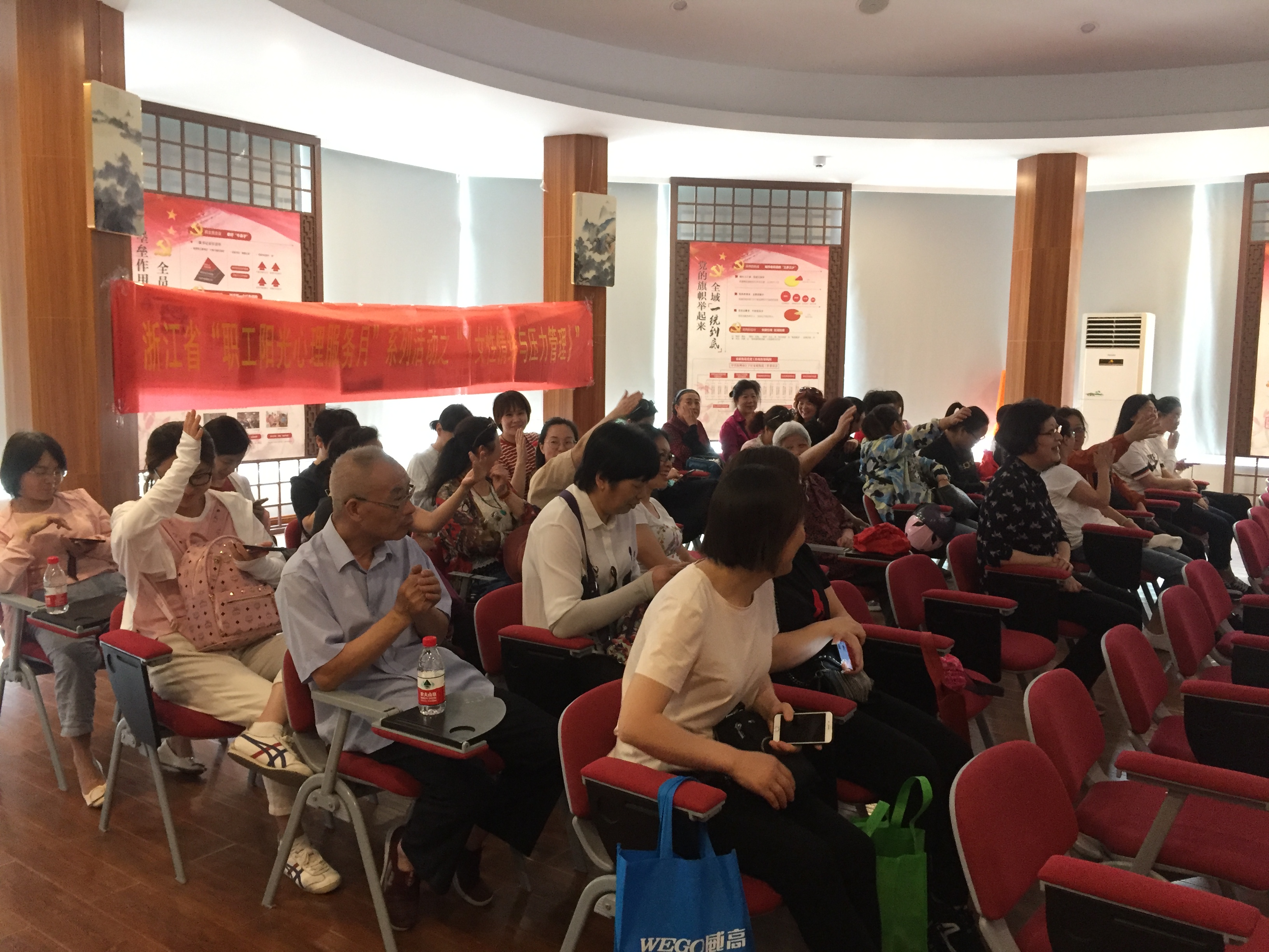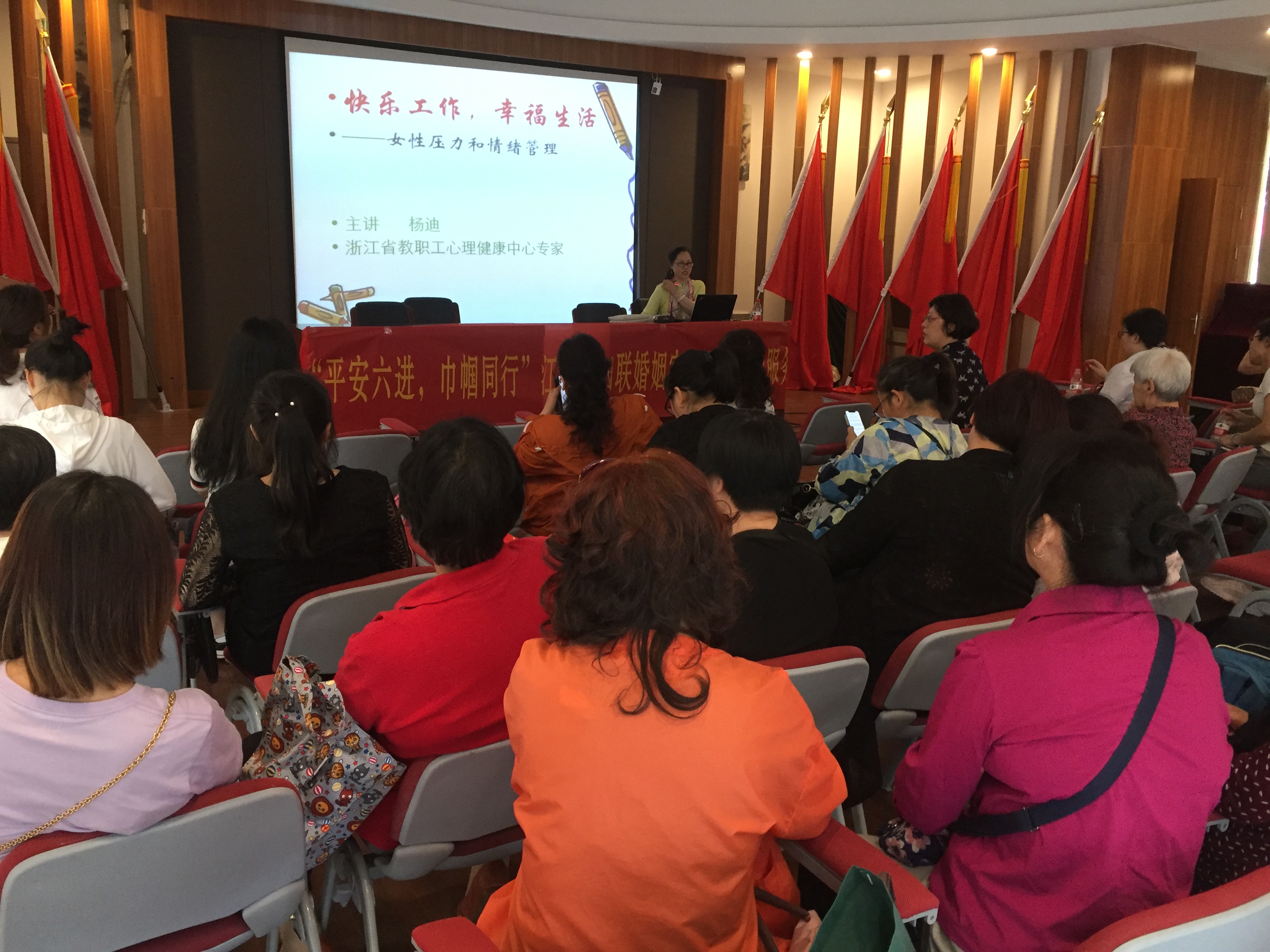 6月3日, 浙江省“职工阳光心理服务月”系列活动之“快乐工作、幸福生活——女性情绪与压力管理”专题讲座走进江干区妇联。本次讲座由浙江省教职工心理健康教育服务中心、江干区妇联共同举办,由浙江省教职工心理健康中心特聘专家杨迪主讲。来自采荷街道的80余名工作人员和群众参与本次活动。
